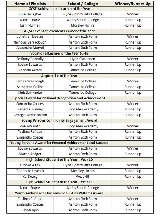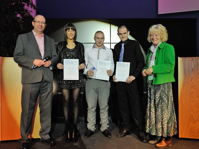 Pride of Tameside Awards Fri, 21 December 2012 Tameside College Apprenticeship students prove they are outstanding at this year’s Pride of Tameside Youth Achievement Awards. James Greenough, studying on a Motor Vehicle Apprenticeship at Tameside College, humbly accepted first place in the Apprentice of the Year category at the Pride of Tameside Youth Achievement Awards, held at the Droylsden Academy this December. It was a proud moment for the College’s Apprenticeship department when it was announced that they had also won both the runner up places in the same category; where Hairdressing Apprentice, Samantha Collins and Motor Vehicle Apprentice, Christian Kinder, took to the stage to receive recognition for their achievements. This year’s Pride of Tameside Youth Achievement Awards was an amazing success and we would like to congratulate all of the 2012 Winners, Runners Up and Nominees. Click the link below to view the Pride of Tameside Youth Achievement Awards Photo Gallery.